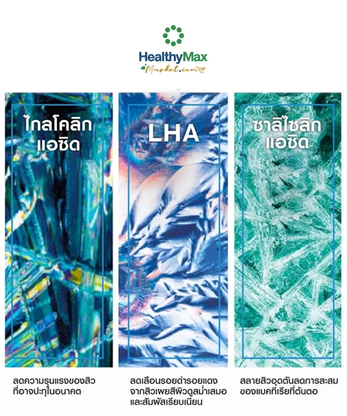 - LHA dissolves acne on the skin surface, removes black and red acne scars, reveals a more even skin tone.