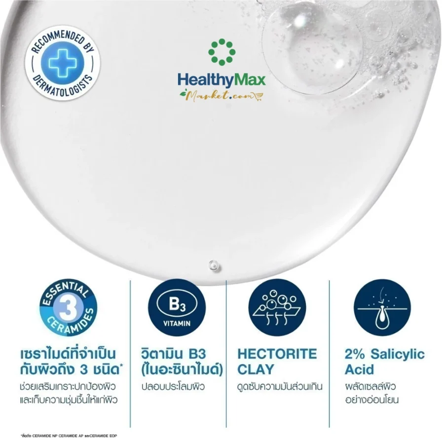 - ด้วยส่วนผสม 2% Salicylic Acid และ Niacinamide และเสริมปราการปกป้องผิวให้แข็งแรงด้วย Ceramides ที่จำเป็นต่อผิวถึง 3 ชนิด