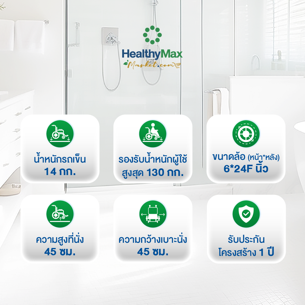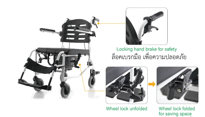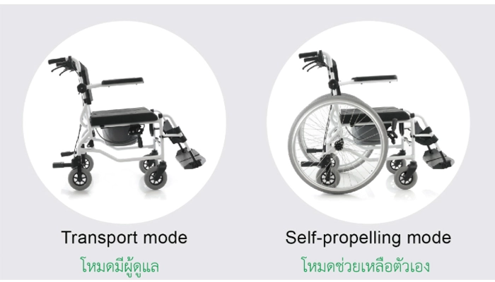 - 2 ฟังก์ชั่นในคันเดียว อเนกประสงค์ สามารถใช้ในการเข้าห้องน้ำ นั่งถ่าย อาบน้ำ อีกทั้งสามารถนั่งเข็นในชีวิตประจำวันได้