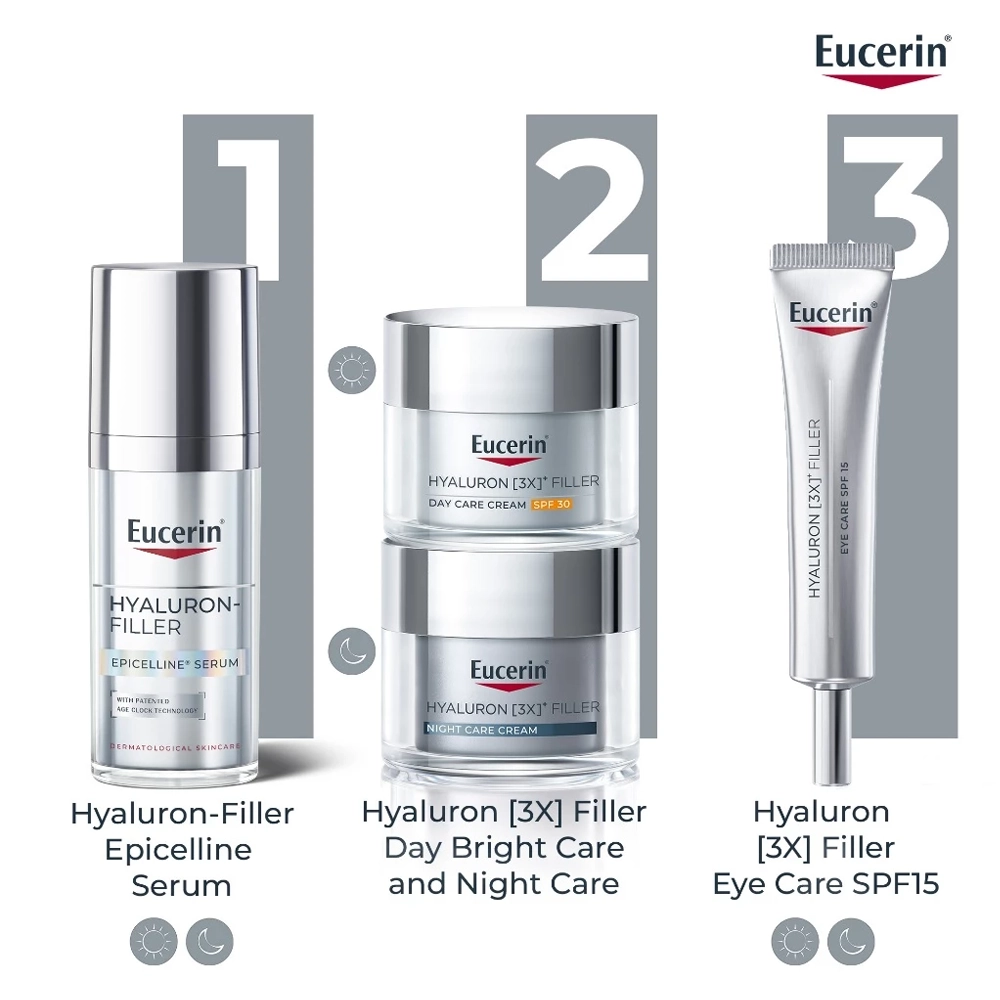 ขั้นตอนต่อไป: เพื่อให้เกิดผลสูงสุด ให้ใช้ยูเซอริน ไฮยาลูรอน ฟิลเลอร์ 3x เดย์แคร์ในตอนเช้า เพื่อให้ผิวชุ่มชื้นและได้รับการปกป้อง และใช้ยูเซอริน ไฮยาลูรอน ฟิลเลอร์ 3x ไนท์แคร์ในตอนกลางคืน เพื่อส่งเสริมการฟื้นฟูของผิวในช่วงข้ามคืน