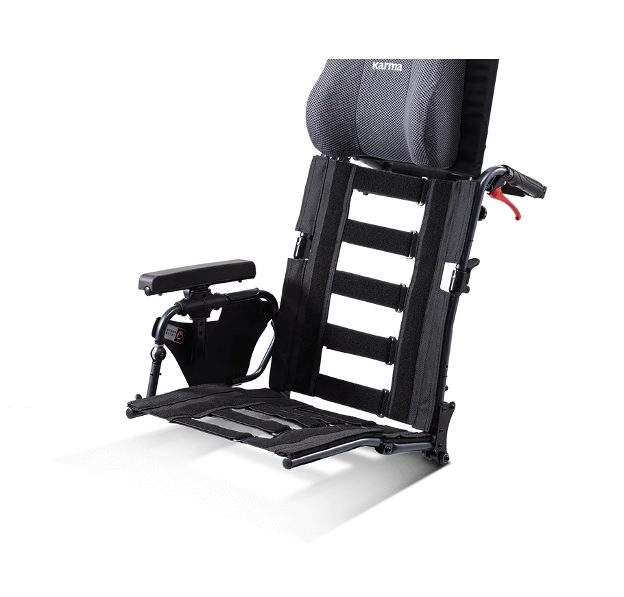 แตกต่างจากวีลแชร์ทั่วไป พนักพิงและเบาะนั่งรุ่นนี้ใช้สายรัดตีนตุ๊กแกที่สามารถปรับความตึงได้ เพื่อให้รองรับสรีระของผู้ใช้งานได้อย่างเหมาะสม ช่วยป้องกันอาการนั่งหลังค่อม และลดปัญหาเบาะยุบตัวเป็นรูปเหมือนเปลแขวน (hammock effect)