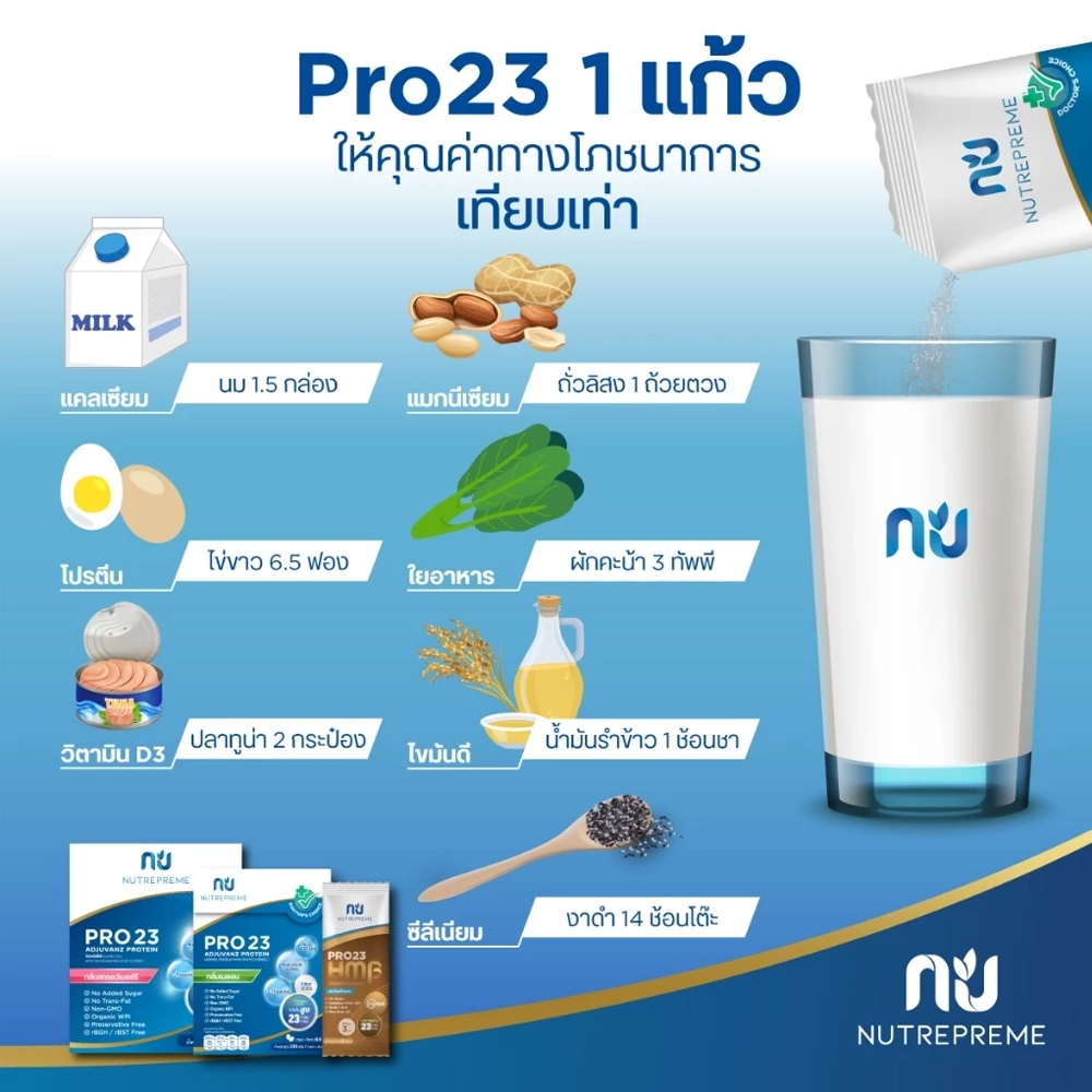 - Whey Protein Isolate (WPI) ที่มีปริมาณสูง 23 กรัม/ซอง