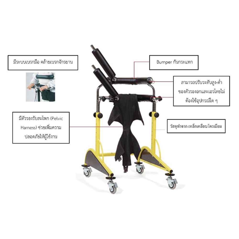- อุปกรณ์ฝึกเดินนี้มีส่วนช่วยพยุง (Frame) บริเวณรอบอก เอว ที่สามารถปรับระดับสูง-ต่ำได้ตามสรีระร่างกายไม่ทำให้ผู้ใช้เอนตัวล้มไปด้านใดด้านหนึ่งมากเกินไป