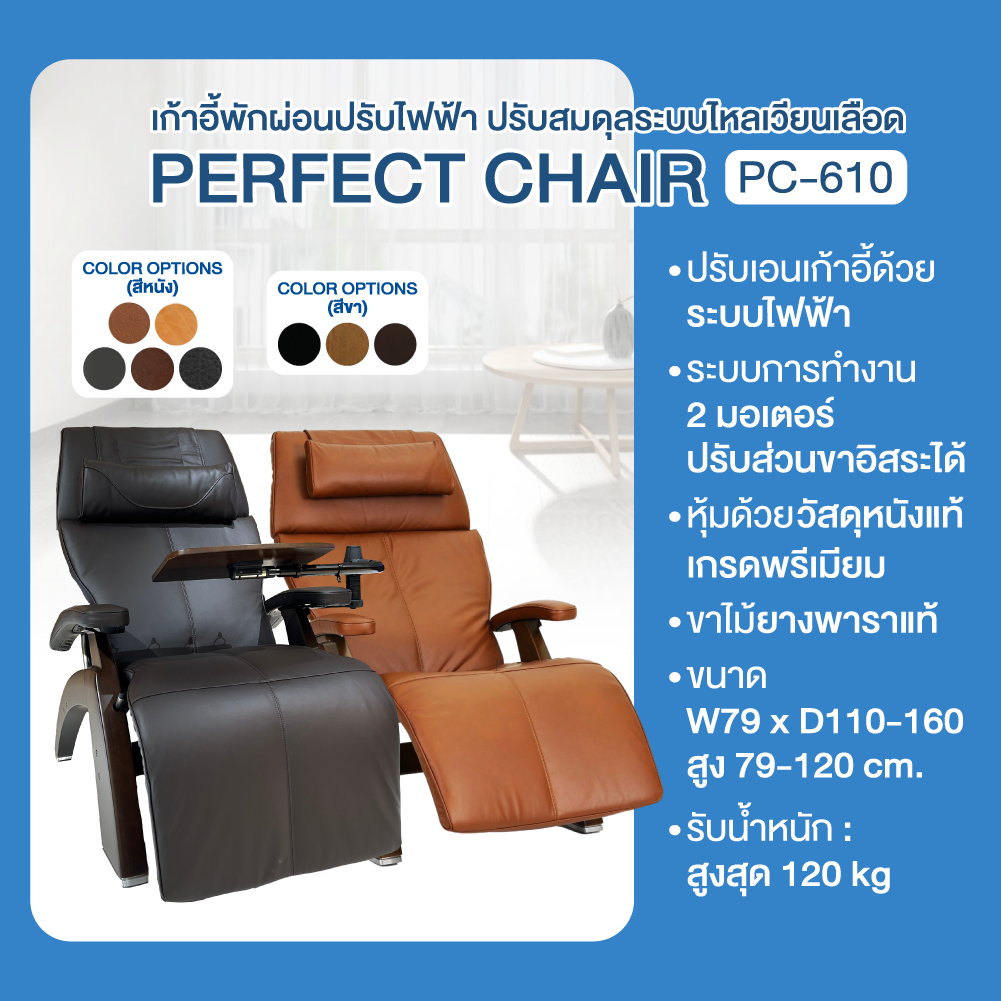 เก้าอี้พักผ่อนปรับระดับได้ Perfect Chair รุ่น PC-610 ได้รับออกแบบและพัฒนาตามหลักสรีระศาสตร์จากแรงบันดาลใจในตำแหน่งท่านั่งของนักบินอวกาศของ NASA ในช่วงขึ้นสู่วงโคจรที่ระดับขาจะอยู่สูงกว่าหัวใจ หรือที่เรียกว่า ตำแหน่งไร้น้ำหนัก (Zero Gravity) ซึ่งเป็นตำแหน่งที่ได้รับการรับรองจากแพทย์ว่าเป็นองศาที่ดีต่อสุขภาพที่สุด พิเศษกว่าด้วยฟังก์ชันปรับไฟฟ้าอิสระได้ดังใจ ปุ่มคอนโทรลปรับระดับแบบ Joystick 5 ทิศทาง ครอบคลุมตั้งแต่ตำแหน่งของศีรษะจรดปลายเท้า ปรับระดับได้อิสระทุกองศา เป็นรุ่นที่สามารถปรับได้มากที่สุดเท่าที่เคยมีมา รองรับสรีระอย่างเหมาะสม ลดอาการเกร็งหรือปวดเมื่อยขณะนั่ง ทำให้สามารถพักผ่อนร่างกายและจิตใจได้อย่างเต็มที่